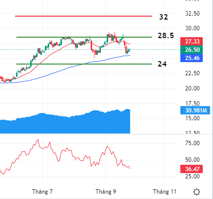 HPG là Bluechip hiếm hoi vẫn giữ được dòng tiền tích cực trong tuần này, có thể một phần nhờ hiệu ứng giải ngân tích cực của Fobon, vùng đỉnh 28.5 sẽ tiếp tục là mục tiêu ngắn hạn trong nhịp hồi lần này.