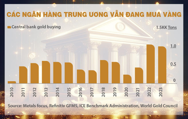 Vậy nhưng tại sao giá vàng cũng lên và trái phiếu vẫn bình ổn? Đó là vì đối trọng lại dòng tiền chảy ra khỏi các quỹ ETF và quỹ đầu tư vàng tư nhân là lực mua vàng của các ngân hàng trung ương và một dòng tiền từ phía Trung Quốc. “Trung Quốc mua vàng nhiều kỷ lục” là tít báo dễ thấy từ suốt tháng 11 năm ngoái tới nay. Đến đầu tháng 3 này, nó đã thành một trong những lực hỗ trợ chủ chốt cho thị trường vàng. Theo Bloomberg, “cơn sốt” vàng trong tuần từ ngày 3 đến 8-3-2024 trên các thị trường toàn cầu xuất phát từ sự phục hồi nhu cầu của người mua tại Trung Quốc.