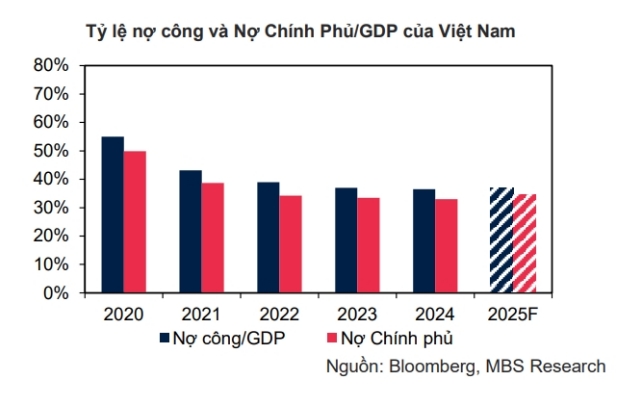 Trong giai đoạn 2020-2024, tỷ lệ nợ công trên GDP của Việt Nam giảm mạnh từ 55% xuống còn 37%, thấp hơn mức trần 50% do Quốc hội quy định. So với các quốc gia ASEAN khác như Thái Lan, Indonesia và Malaysia, có tỷ lệ nợ công khoảng 50%, mức nợ công của Việt Nam hiện tại thấp hơn đáng kể. Điều này tạo điều kiện cho Chính phủ tăng cường chi tiêu cho xây dựng hạ tầng thông qua ngân sách và phát hành trái phiếu.