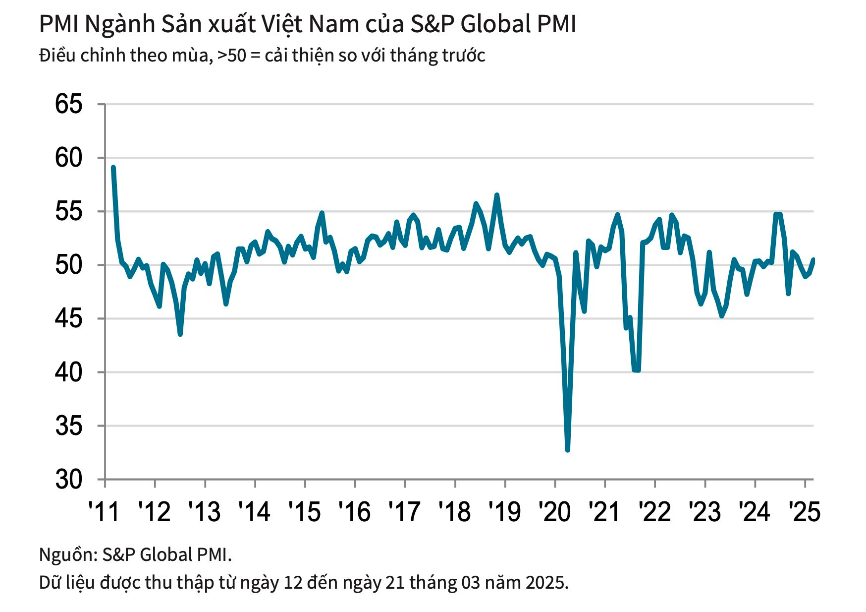 Theo báo cáo mới nhất từ S&P Global, ngành sản xuất Việt Nam đã có dấu hiệu phục hồi trong tháng 3/2025. Cụ thể, Chỉ số Nhà Quản trị Mua hàng (PMI) đạt 50,5 điểm, tăng từ mức 49,2 điểm của tháng 2, đánh dấu lần đầu tiên trong bốn tháng PMI vượt ngưỡng 50 điểm, cho thấy sự cải thiện trong điều kiện kinh doanh của ngành sản xuất.