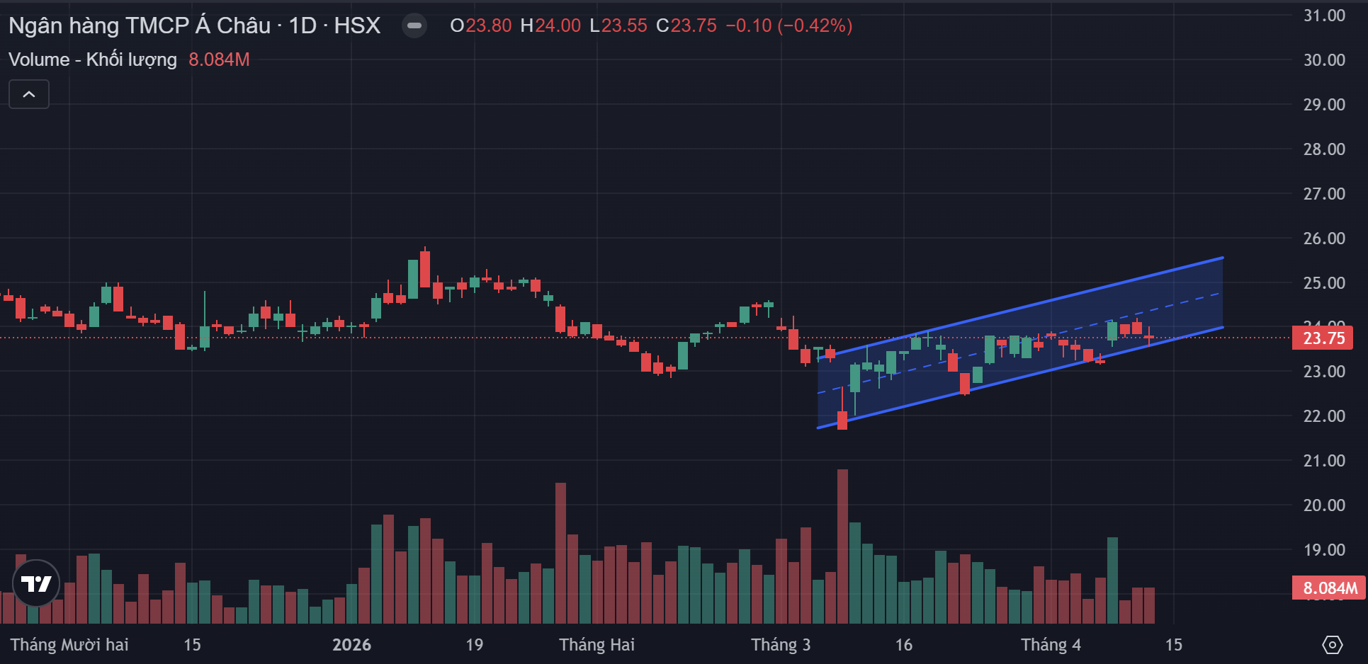 Trong ngắn hạn, kênh tăng giá của ACB đang được duy trì tương đối rõ với các đáy sau cao hơn đáy trước, cho thấy lực cầu vẫn đóng vai trò nâng đỡ xu hướng ngắn hạn. Giá hiện vận động quanh vùng midline (đường giữa kênh), phản ánh trạng thái cân bằng tạm thời giữa bên mua và bên bán. Việc nhiều lần kiểm định thành công cạnh dưới cho thấy đây là vùng hỗ trợ động đáng tin cậy.