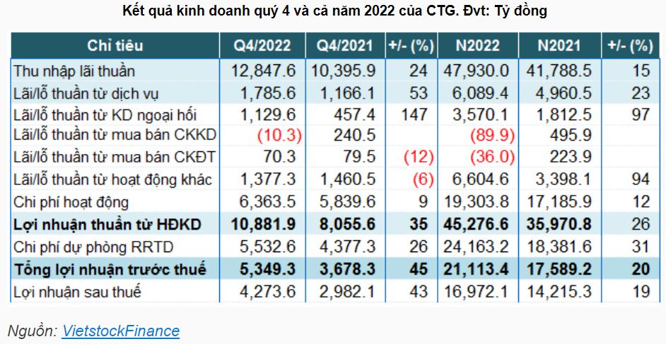 CTG báo cáo NIM gần như đi ngang đạt 2,98% (-3 điểm cơ bản YoY) trong năm 2022 so với 2021. Tuy nhiên, tăng trưởng tín dụng ổn định ở mức 12,2% YoY phần nào giúp NII năm 2022 tăng 14,7% đạt 47,9 nghìn tỷ đồng.
