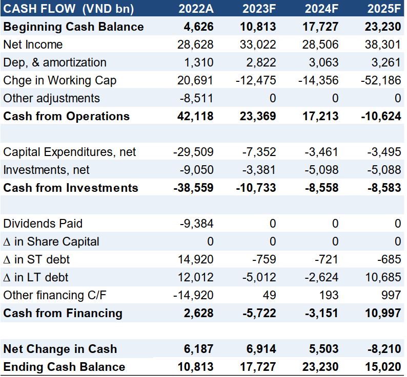 Tuy nhiên, theo quan điểm của chúng tôi, vị thế tài chính của VHM vẫn lành mạnh với sự hỗ trợ từ dòng tiền thu về từ doanh số bán hàng chưa ghi nhận và các giao dịch bán buôn tiềm năng trong năm 2023. Tính đến cuối năm 2022, các khoản khách hàng đã thanh toán đạt 94,4 nghìn tỷ đồng – +2,7 lần so với cuối năm 2021.”