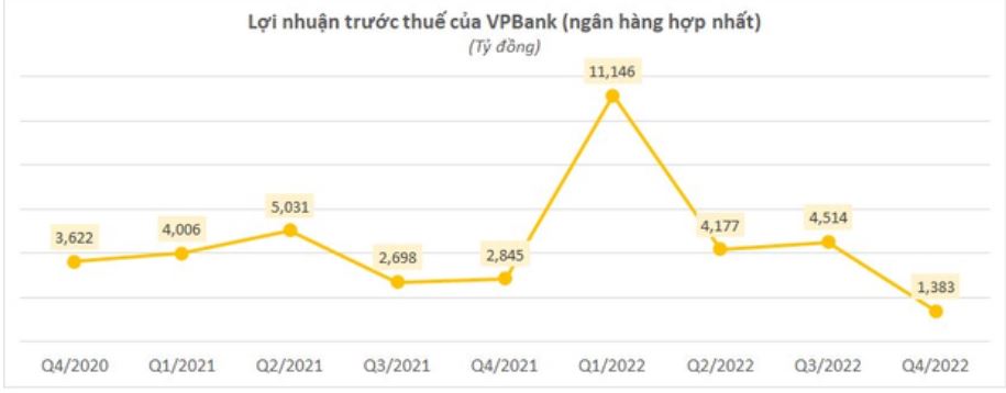 VPB công bố lợi nhuận trước thuế quý 4/2022 chỉ đạt 1.383 tỷ đồng, giảm 47% so với cùng kỳ năm 2021. Nguyên nhân chủ yếu do ngân hàng tăng mạnh chi phí hoạt động và chi phí dự phòng rủi ro.