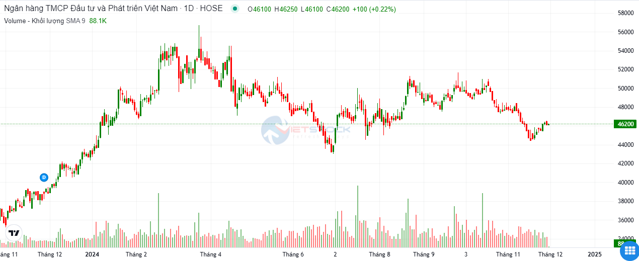 Sau giai đoạn giảm điểm kéo dài từ tháng 8 đến tháng 11, cổ phiếu BID đang có dấu hiệu phục hồi nhẹ từ vùng đáy khoảng 44,000 đồng/cp.