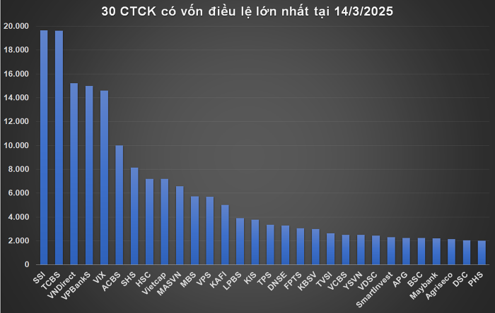 Các công ty khác như Chứng khoán VNDirect (VND), Chứng khoán VIX (VIX), Chứng khoán Thành Phố Hồ Chí Minh (HSC), Chứng khoán Vietcap (VCI) cũng đã nâng vốn điều lệ lên lần lượt 15.223 tỷ đồng, 14.585 tỷ đồng, 7.208 tỷ đồng và 7.181 tỷ đồng.