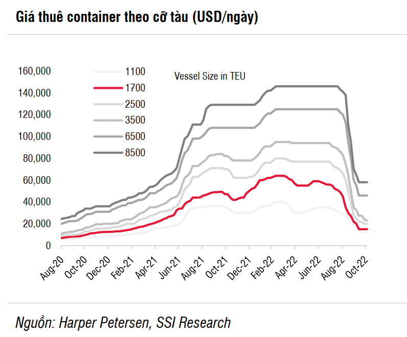 Giá cước vận tải biển (World Container Index) đã giảm hơn 3 lần so với vùng đỉnh, giá cho thuê tàu đã giảm tới hơn 30%. Dự kiến xu hướng này sẽ tiếp diễn và giá cước vận tải biển sẽ giảm tới hết Q1/2023 rồi ổn định và trở về mức trước dịch.