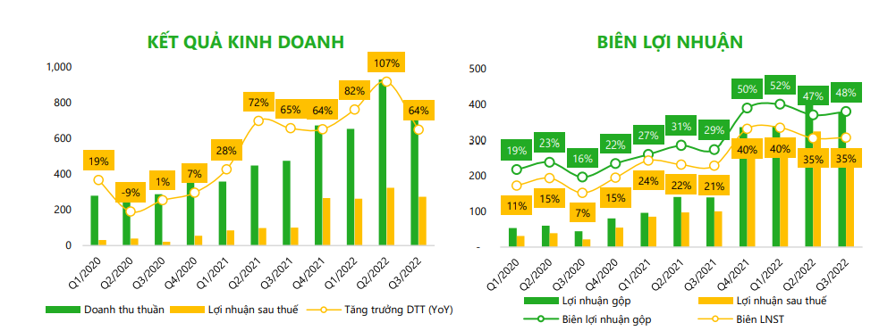 Doanh thu đạt 779 tỷ đồng, tăng trưởng 64% so với cùng kỳ năm 2021. Chi phí giá vốn chỉ tăng thêm 20%, giúp lợi nhuận gộp gấp gần 3 lần cùng kỳ lên mức 377 tỷ đồng, biên lợi nhuận quý 3 tăng cải thiện từ 29% của quý 3 năm ngoái lên mức 48%.