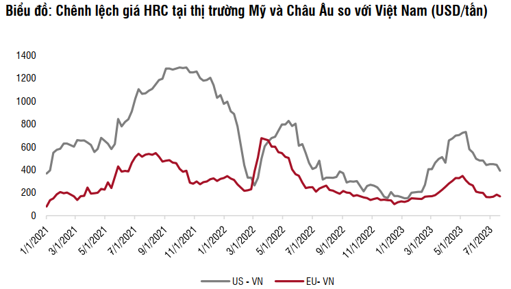 Tuy nhiên, so với các tháng trước, nhu cầu nhập khẩu từ các thị trường này có thể giảm tốc do tiêu dùng chậm lại và hàng nhập khẩu giá rẻ từ châu Á. Điều này có thể được phản ánh thông qua việc giá thép tại các thị trường này giảm hơn 20% so với mức đỉnh trong tháng 4/2023. Chênh lệch giữa giá HRC tại thị trường Mỹ và Châu Âu so với Việt Nam theo giá trị tuyệt đối cũng đã thu hẹp đáng kể gần 60%, lần lượt từ 350-700 USD/tấn tại thời điểm cuối tháng 4 xuống mức 180-400 USD/tấn vào cuối tháng 6.