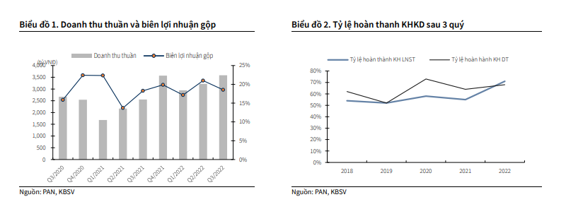 Quý III/2022, doanh thu thuần của PAN đạt 3.585 tỷ đồng, tăng 40% so với cùng kỳ năm trước. Bên cạnh đó, các chỉ tiêu lợi nhuận trước thuế và lợi nhuận sau thuế tăng trưởng mạnh, tương ứng tăng 127% đạt mức 177 tỷ đồng và tăng 94% lên mức 142 tỷ đồng so với quý III năm ngoái.