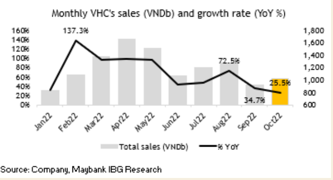 Trong tháng 10/2022, tổng doanh thu của VHC có sự cải thiện theo quý đạt 1 nghìn tỷ đồng (+ 10,6% t/t; 26% n/n), trong đó doanh thu từ cá phi lê, mảng đóng góp cao nhất, chỉ tăng 1% so với cùng kỳ đạt 601 tỷ đồng. Nhìn chung, tốc độ tăng trưởng của VHC đang có sự chậm lại trong khi Mỹ, thị trường xuất khẩu chính, giảm 13% so với cùng kỳ năm ngoái (29% t/t, 38% so với tháng 10/20221).