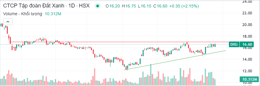 DXG đang tiệm cận vùng kháng cự mạnh xung quanh mức 17-18. Đây là vùng giá mà DXG đã từng chạm đến trong các đợt tăng trước đó nhưng không thể bứt phá, dẫn đến các nhịp điều chỉnh giảm.