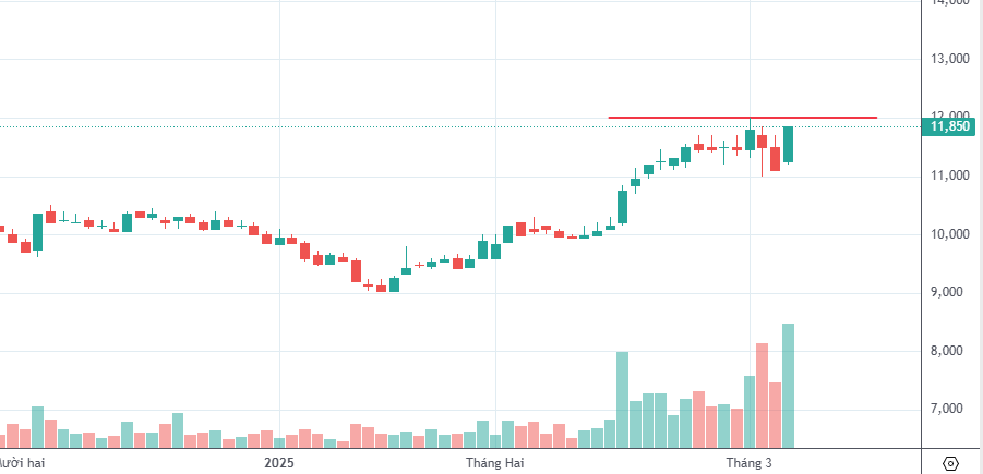 Thanh nến gần nhất: Nến xanh thân dài, đóng cửa 11.850 đồng, cho thấy lực mua mạnh trở lại sau nhịp điều chỉnh ngắn hạn. Khối lượng giao dịch tăng vọt so với các phiên trước, chứng tỏ dòng tiền lớn đang quay lại.