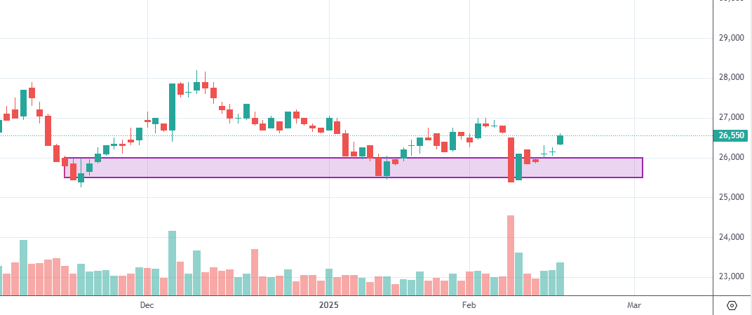Kháng cự: 27.000 – 27.500 đồng (đỉnh gần nhất trước khi điều chỉnh, có thể là vùng cản mạnh).