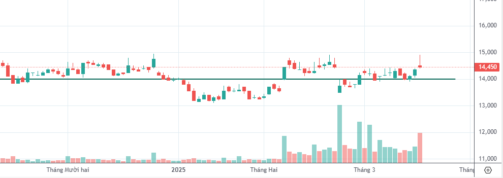 Kháng cự: 14.500 (đỉnh gần nhất, có nhiều lần kiểm tra nhưng chưa vượt qua).