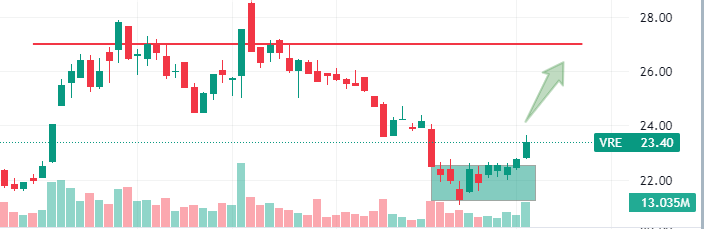 Nhà đầu tư lướt sóng có thể tham gia vào cổ phiếu VRE với kỳ vọng nhịp tăng lần này sẽ đưa cổ phiếu quay trở lại vùng giá 26-27 gần nhất.