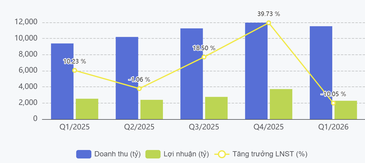 Kết quả, lợi nhuận trước thuế đạt 2.826 tỷ đồng, giảm 11%, và lợi nhuận sau thuế đạt 2.279 tỷ đồng, giảm 10,1%. Tính đến 31/3/2026, tổng tài sản đạt 580.860 tỷ đồng, giảm 4,1%; dư nợ cho vay tăng 2,9% lên 403.026 tỷ đồng, trong khi tiền gửi khách hàng tăng 2,4%, đạt 345.760 tỷ đồng.
