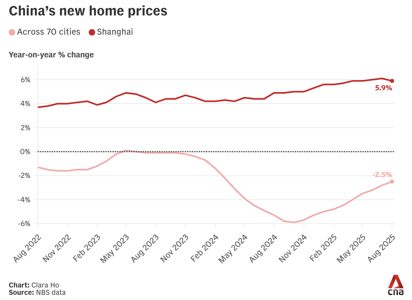 Theo dữ liệu, đầu tư vào nhà ở trên toàn quốc giảm 10,9% y/y (1–7/2025). Ngược lại, ở Thượng Hải tăng 3,3%.