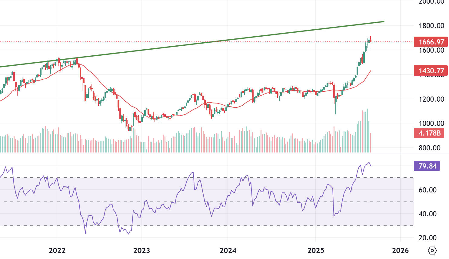 Vùng hỗ trợ gần nhất: 1,585–1,600 (đáy nến tuần trước). Nếu thủng vùng này kèm khối lượng cao có thể xác nhận điều chỉnh mạnh hơn.