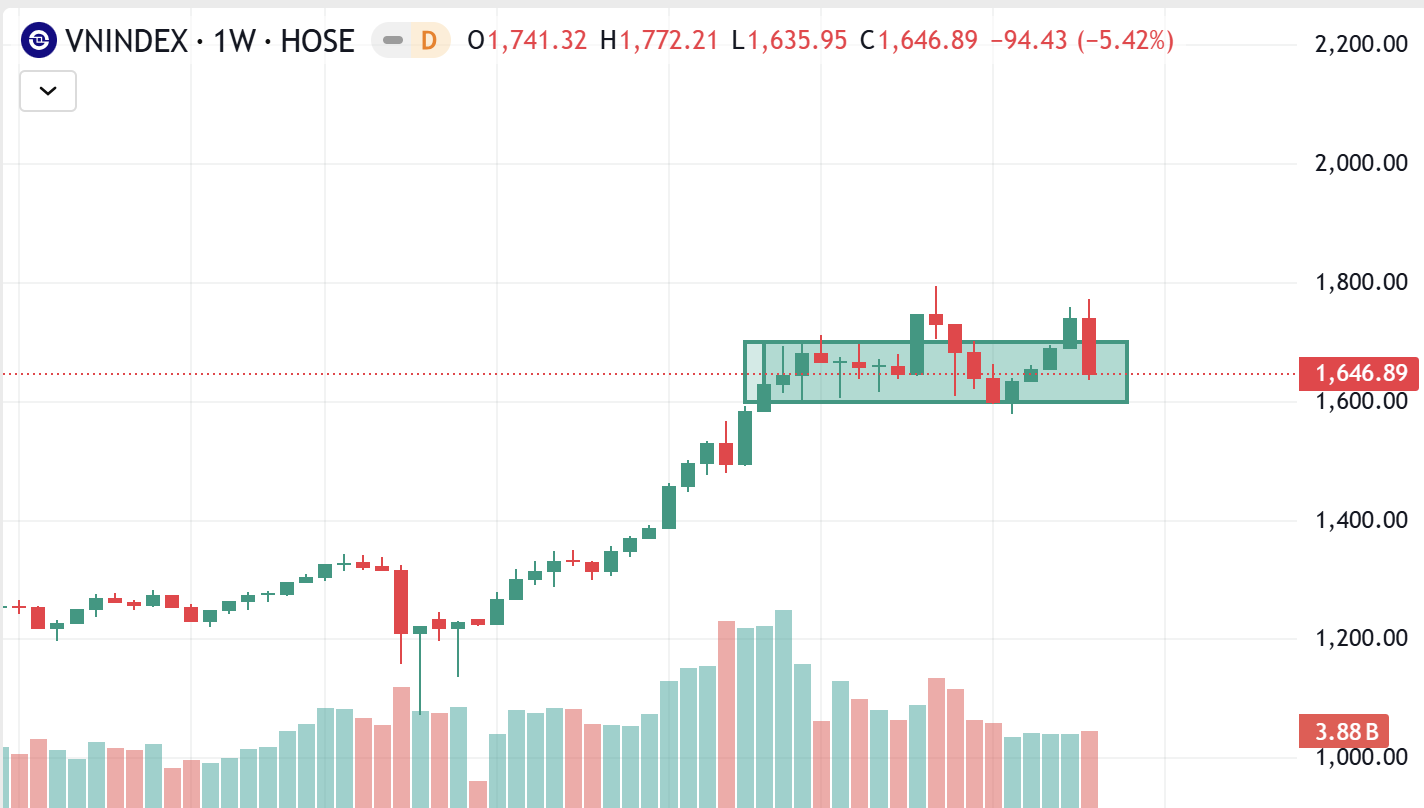 Nến tuần gần nhấtlLà nến giảm thân dài, đóng cửa thấp, biên độ lớn. Bóng trên dài → bị từ chối giá mạnh ở vùng cao. Đây là mẫu nến điển hình của Failed Breakout / Bull Trap trên khung tuần. VN-Index đang quay lại vùng tích lũy rộng sau một nhịp tăng mạnh (range 1.600 – 1.750).