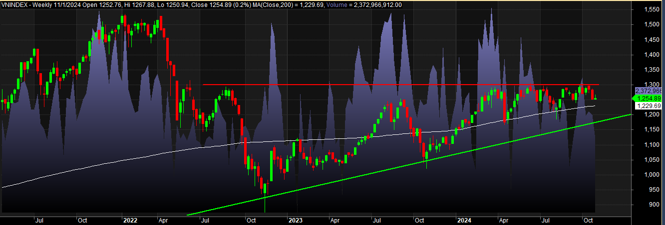 VN-Index hiện tại vẫn đang trong xu hướng tăng dài hạn, nhưng cần phá vỡ kháng cự 1,300 để xác nhận xu hướng tăng tiếp tục. Trong trường hợp không phá vỡ được mức này, các mức hỗ trợ tại MA200 và đường xu hướng tăng dài hạn là những vùng quan trọng cần theo dõi.