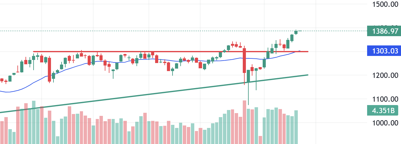 Nhà đầu tư trung hạn nắm giữ vị thế đã mua từ vùng 1.300–1.330. Có thể chốt lời dần khi chỉ số tiếp cận vùng 1.400–1.420.