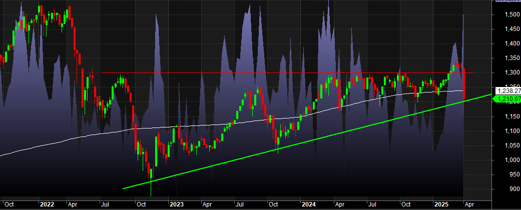 Nến tuần gần nhất là một cây nến đỏ dài với thân nến phủ nhận toàn bộ thân nến xanh của các tuần trước – đây là mô hình bearish engulfing (nhấn chìm giảm) ở khung tuần. Điều này thể hiện lực bán áp đảo khi chỉ số thất bại trong việc giữ vùng breakout phía trên 1.300 và nhanh chóng bị kéo ngược trở lại. Điểm đáng chú ý là nến này đóng cửa dưới cả đường MA200 tuần và cắt xuống khỏi trendline ngắn hạn, cho thấy tâm lý thị trường chuyển sang tiêu cực trong ngắn hạn.