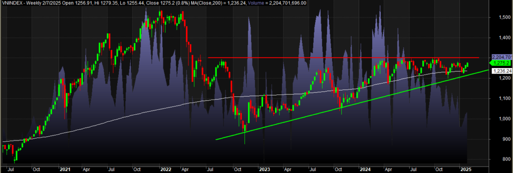 VN-Index vẫn duy trì xu hướng tăng trung hạn, được hỗ trợ bởi đường trendline tăng. Giá đang nằm trên MA200, cho thấy động lực tăng vẫn đang được giữ vững. Tuy nhiên thanh khoản chỉ duy trì ổn định, chưa có sự bùng nổ mạnh để phá kháng cự. Chỉ còn khoảng 25 điểm nữa để Vnindex chạm kháng cự mạnh 1300, có lẽ thị trường sẽ cần có những phiên tích lũy trước khi vượt kháng cự.