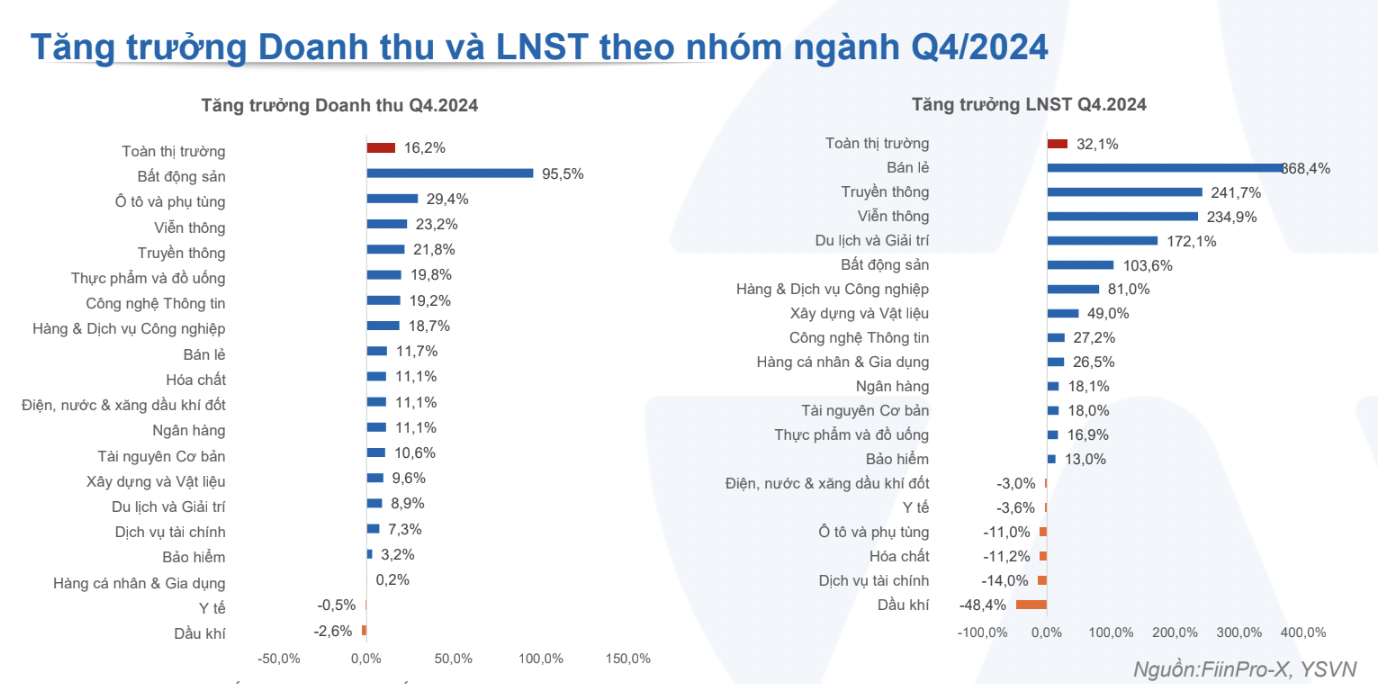 Lĩnh vực phi tài chính có mức tăng trưởng lợi nhuận lên tới 48,7% so với cùng kỳ, vượt bậc hơn hẳn so với lĩnh vực tài chính, đây là quý ghi nhận lợi nhuận cao nhất của lĩnh vực phi tài chính sau đại dịch đến nay. Trong đó, bán lẻ ghi nhận mức tăng trưởng lợi nhuận sau thuế quý 4/2025 cao nhất đạt 368,5%; viễn thông tăng 234,9%; Bất động sản tăng trưởng 103,6%. Dầu khí tăng trưởng 81%; Vật liệu xây dựng tăng 49%.