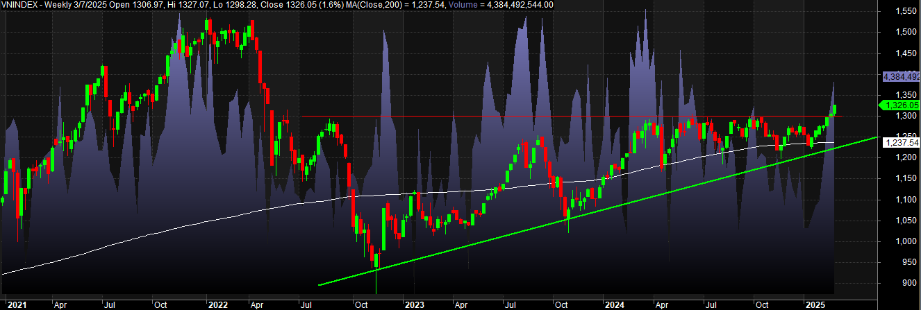 Trong tuần vừa qua, VN-Index có một cây nến tăng mạnh, đóng cửa trên vùng kháng cự 1.300 – 1.325. Điều này cho thấy bên mua đang kiểm soát thị trường, đồng thời phá vỡ vùng kháng cự quan trọng đã tồn tại hơn một năm. Thanh khoản trong tuần vừa rồi cũng có sự cải thiện, xác nhận sự bứt phá. Việc giá bám vào đường trendline tăng và vượt đỉnh cũ cho thấy lực cầu mạnh mẽ, khả năng cao xu hướng tăng sẽ tiếp tục.