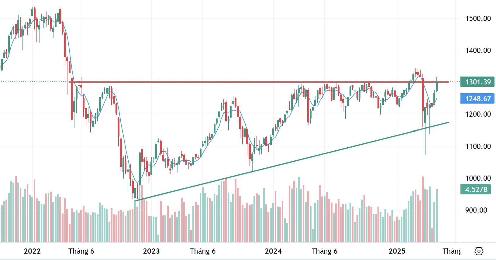 Nến tuần gần nhất là một cây nến xanh thân dài, đóng cửa ngay sát vùng 1.300 điểm — phục hồi mạnh mẽ sau cú sập trước đó.