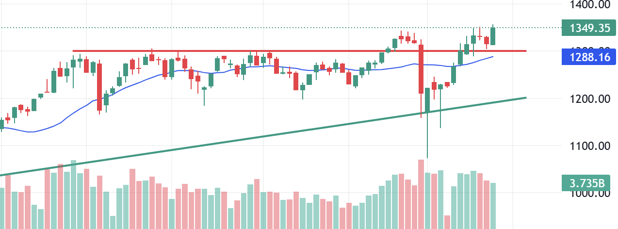 Kịch bản tích cực: Vnindex vượt 1350 và hướng tới các mục tiêu gần nhất 1.370–1.380 điểm (vùng cản nhẹ tiếp theo). Mục tiêu xa hơn sẽ là 1.400–1.420 điểm, vùng đỉnh cũ giữa 2022.