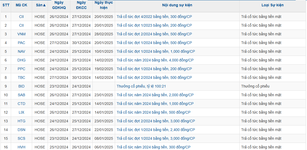 Lịch sự kiện một số doanh nghiệp niêm yết