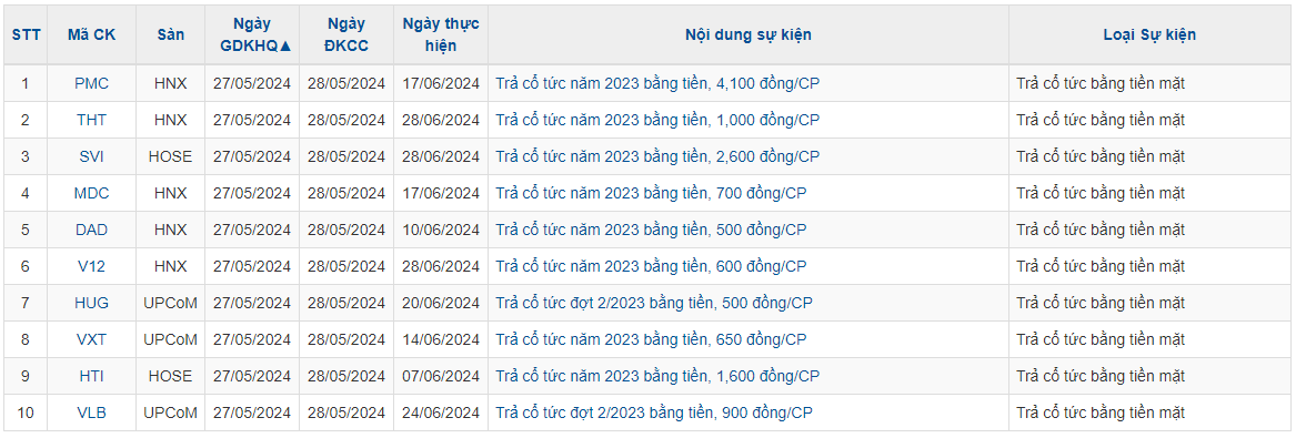 Lịch sự kiện một số doanh nghiệp niêm yết tuần này