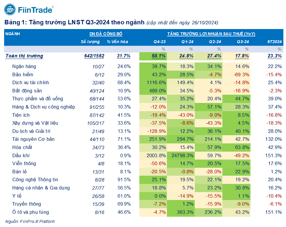 Nhóm có tăng trưởng lợi nhuận cao vẫn là Thực phẩm, Chăn nuôi, Vật liệu xây dựng, Thép, Cao su, Vận chuyển hành khách.