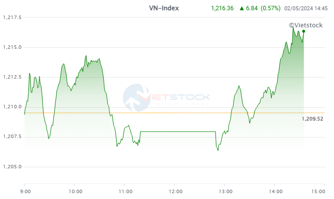 Càng về cuối ngày bên mua càng nắm thế chủ động và tích cực đẩy giá tăng. Kết thúc phiên giao dịch, VN-Index tăng 6.84 điểm lên 1,216.36 điểm.
