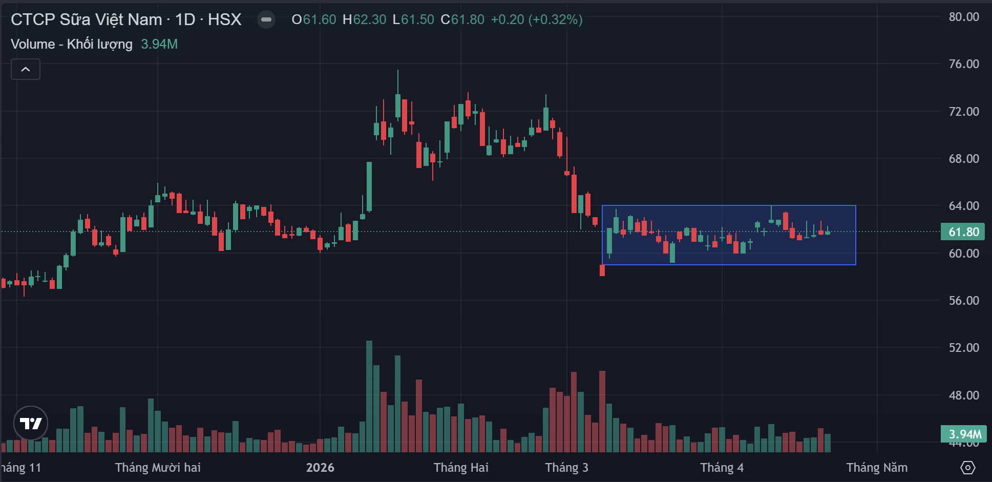 Sau nhịp tăng giá bất thành đầu năm 2026, giá VNM đã dừng lại quanh vùng 59 – 60 và bắt đầu tạo nền đi ngang. Đây là vùng cân bằng nơi lực bán trước đó đã suy yếu, trong khi lực mua bắt đầu xuất hiện nhưng chưa đủ mạnh để đảo chiều xu hướng.