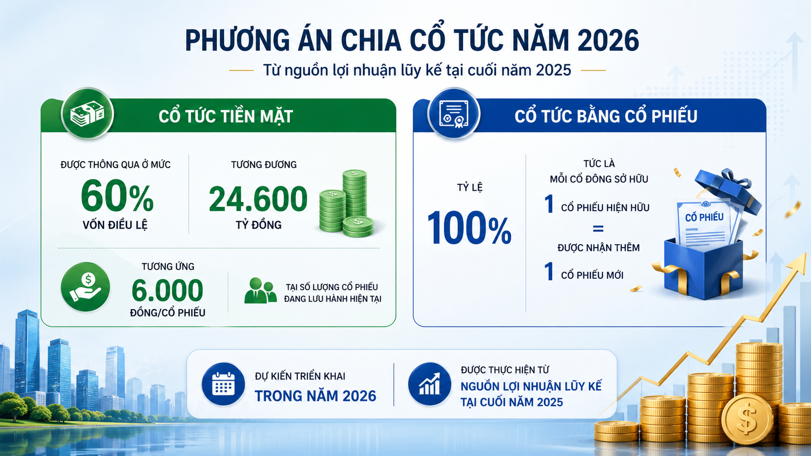 Cổ tức tiền mặt được thông qua ở mức 60% vốn điều lệ, tương đương 24.600 tỷ đồng, tương ứng 6.000 đồng/cổ phiếu tại số lượng cổ phiếu đang lưu hành hiện tại. Cổ tức bằng cổ phiếu với tỷ lệ 100%, tức là mỗi cổ đông sở hữu 1 cổ phiếu hiện hữu sẽ được nhận thêm 1 cổ phiếu mới. Dự kiến triển khai trong năm 2026, được thực hiện từ nguồn lợi nhuận lũy kế tại cuối năm 2025.