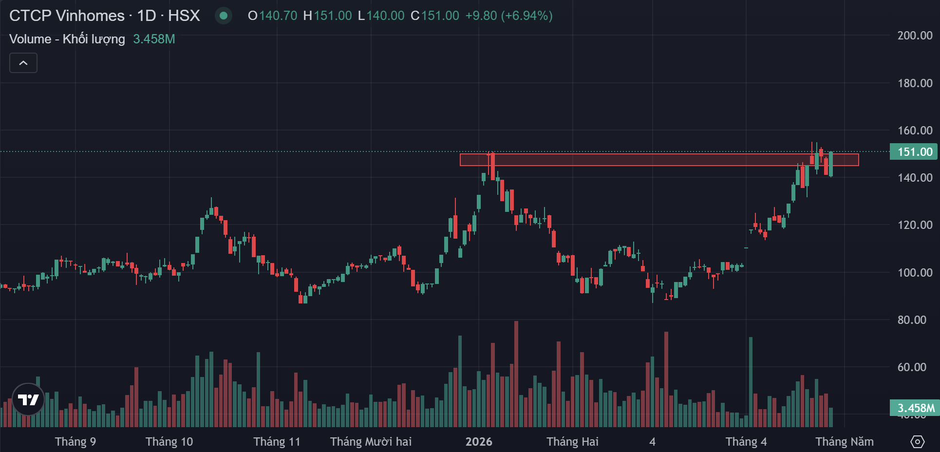 Diễn biến giá hiện tại của VHM phản ánh một xu hướng tăng sau khi thoát khỏi vùng tích lũy kéo dài quanh 100 – 110
